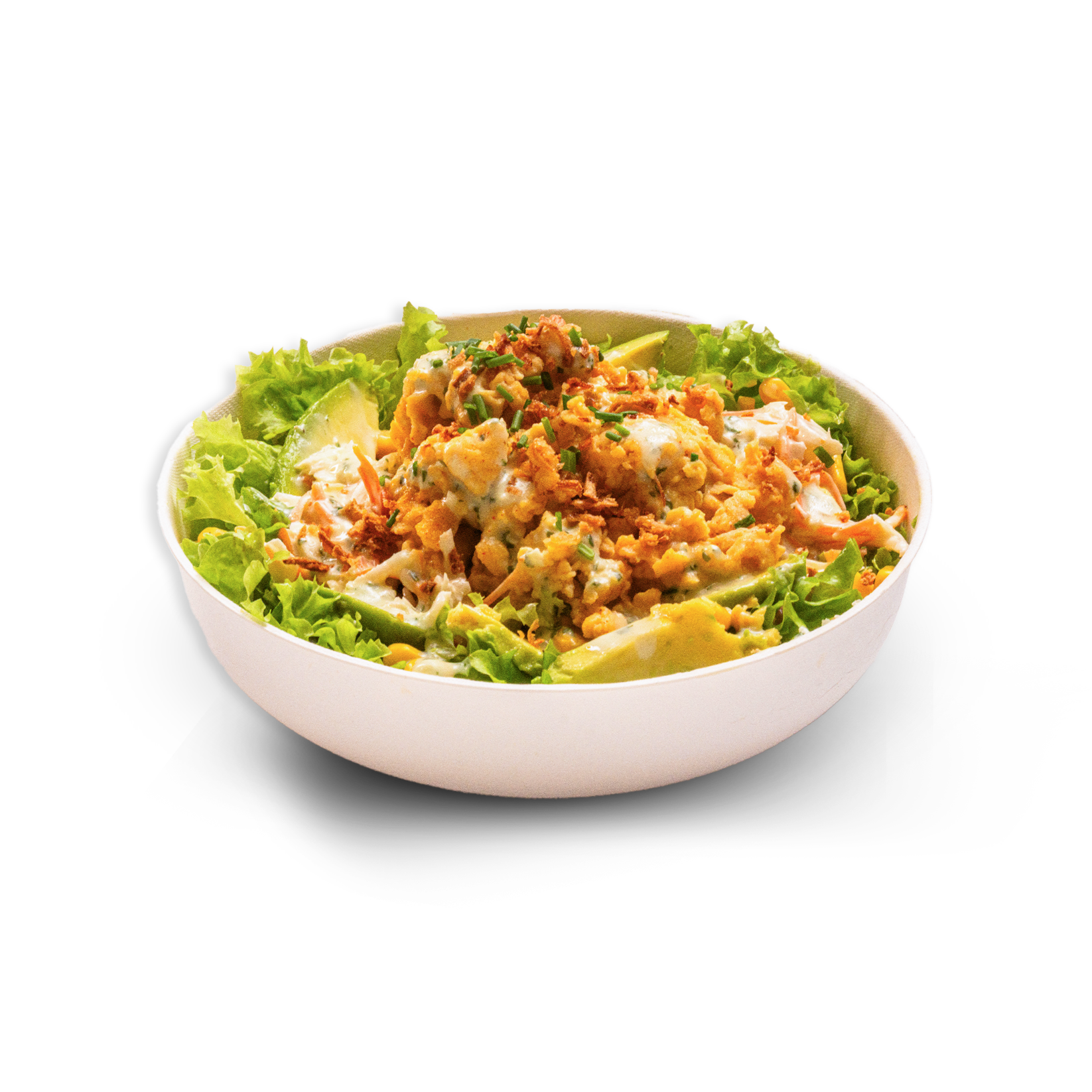 Salade met Avocado, EXTRA Swegg™ scrambled egg, basilicum yoghurtsaus van 0% vet, mais, frisse koolsla en gebakken uitjes.