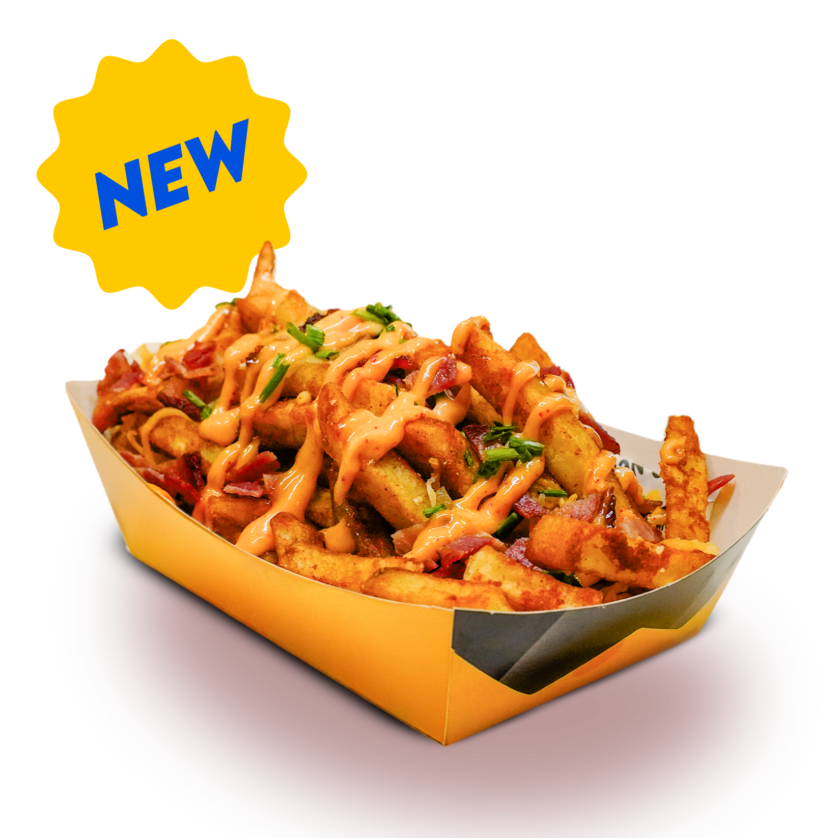 Zoete aardappel friet getopt met kaas, fijngesneden peterselie, bosui, pepertjes en romige truffel saus